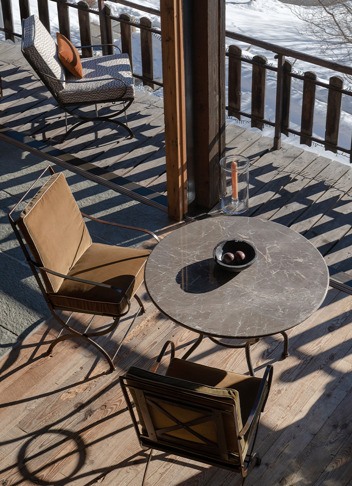Une utilisation intérieure de nos chaises, tables et fauteuils. Une rénovation exceptionnelle dans un cadre idyllique, au coin du feu, le mélange du bois et du fer forgé. Unique : coussins utilisant des tissus de la maison Pierre Frey.