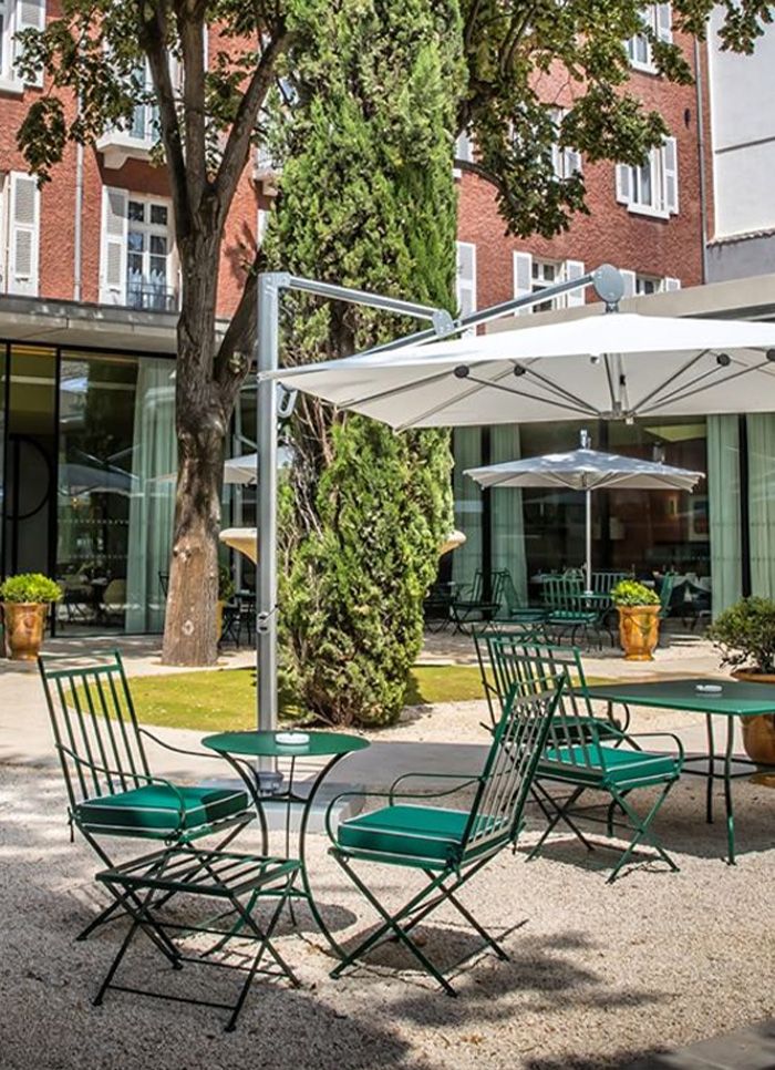 Une rénovation très soignée pour L’Imperator, un des hôtels les plus iconiques de Nîmes. En plein centre-ville sa terrasse cachée est l’une des plus agréables de cette région du sud de la France. Tables et chaises dans un ton de vert aussi classique que contemporain dans cette décoration léchée.